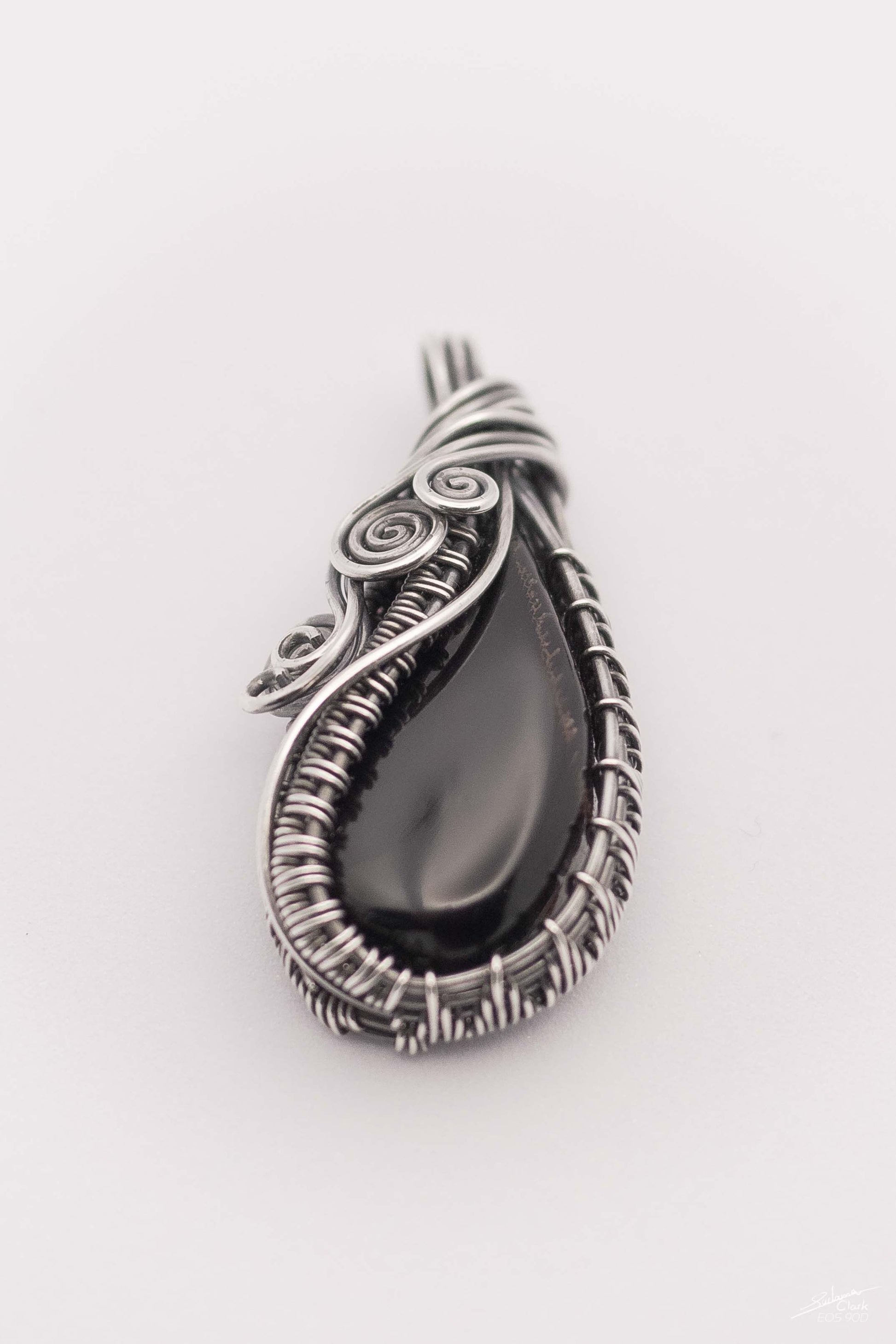 A teardrop shaped pendant made in Argentium Silver wrapped around a polished cow hoof.